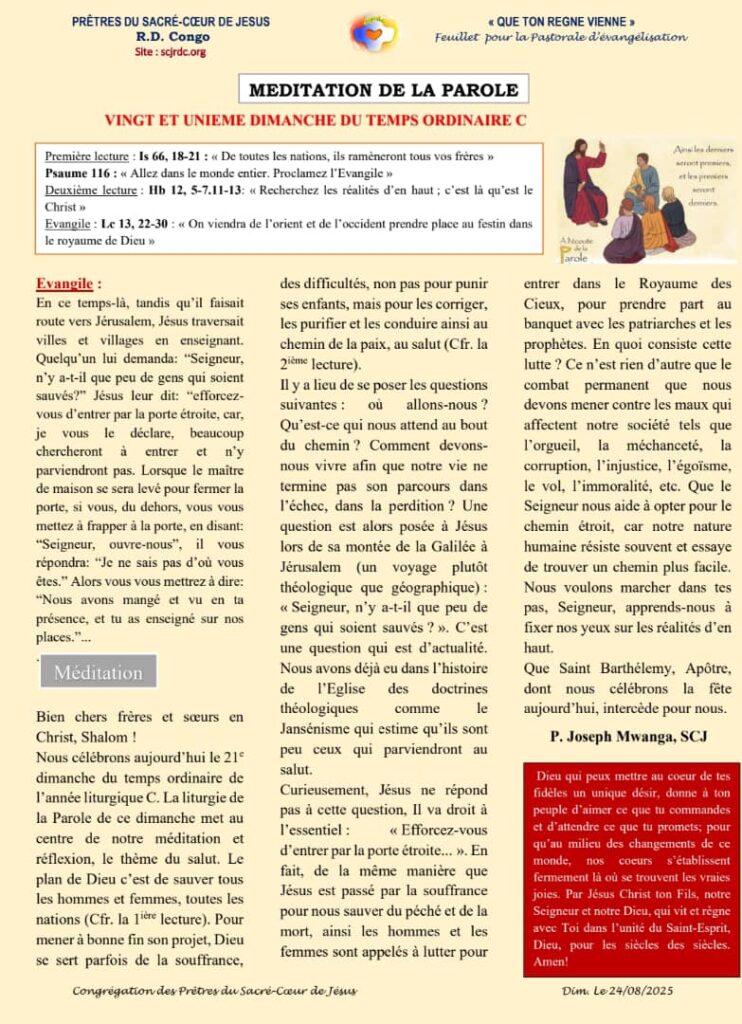 Nous célébrons aujourd’hui le 21e dimanche du temps ordinaire de l’année liturgique C. La liturgie de la Parole de ce dimanche met au centre de notre méditation et réflexion, le thème du salut. Le plan de Dieu c’est de sauver tous les hommes et femmes, toutes les nations (Cfr. la 1ière lecture). Pour mener à bonne fin son projet, Dieu se sert parfois de la souffrance, des difficultés, non pas pour punir ses enfants, mais pour les corriger, les purifier et les conduire ainsi au chemin de la paix, au salut (Cfr. la 2ième lecture).
